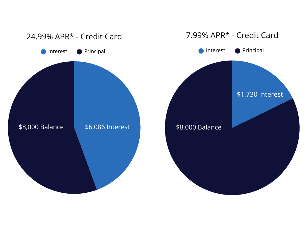 The graphs below illustrate the impact of a lower rate. Assuming no extra charges are being made, and you are making payments to the card in a span of 60 months, the graph on the left shows how much interest you would pay on a high-rate credit card, and the graph on the right shows how much interest you would pay on a low-rate Houston Police Credit Union credit card.
